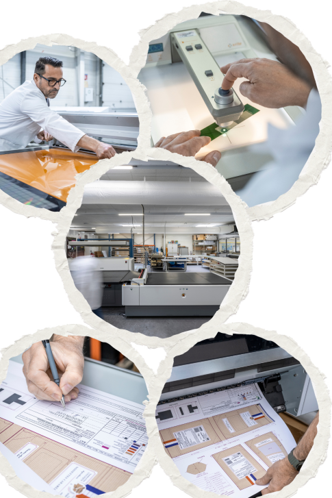 Ces diverses opérations consistent à mettre en page et assembler les fichiers graphiques en vue de produire des épreuves couleur calibrées, servant de référence chromatique pour le rendu final des modèles, ainsi qu’à fabriquer les clichés destinés à être montés sur la ligne d’impression flexographique de Pont-Évêque.