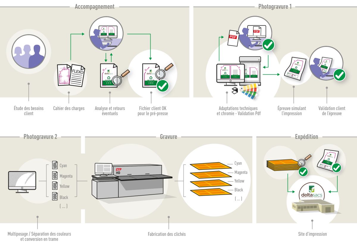 Deltasacs est intégré en photogravure. L’unité de prépresse et gravure se situe à Saint Jean de Muzols en Ardèche. Ce site regroupe l'ensemble des opérations qui précèdent l'impression.